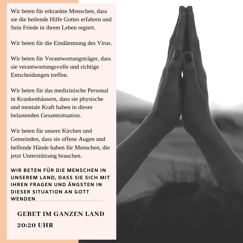Deutschland betet täglich um 20:20 Uhr Eine Aktion der Deutschen Evangelischen Allianz: Täglich um 20:20 Uhr sind alle eingeladen zum Gebet im ganzen Land